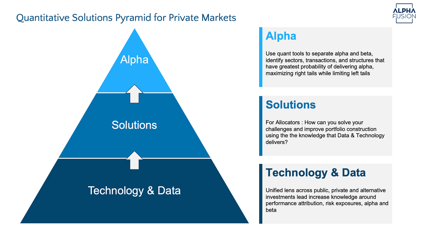 There are three stages of evolution in the use of quantitative technology to improve investor outcomes from private investing. The first is Technology & Data, which then leads to better Solutions, and ultimately helps generate Alpha.