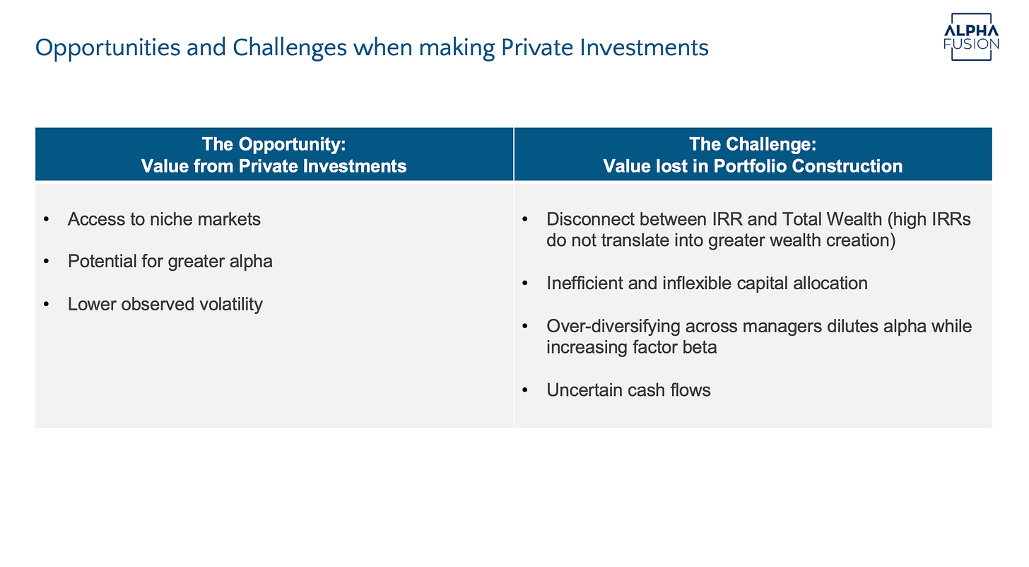 LPs recognize both the value that private markets bring to their portfolio (access to niche markets, potential for greater alpha, lower observed volatility) and the challenges they face when allocations to private assets become material (disconnect between IRR and actual wealth created, inflexible and inefficient capital allocation, over-diversifying across managers dilutes alpha, uncertain cash flows).
